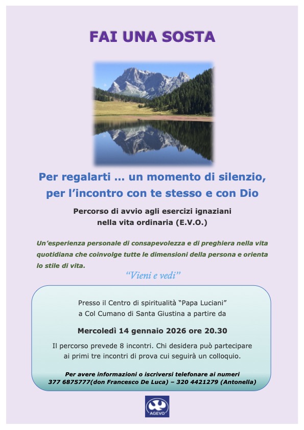 È proposto un percorso di avvio agli Esercizi Spirituali Ignaziani nella vita quotidiana (E.V.O.), un’esperienza personale di preghiera, silenzio e consapevolezza che coinvolge tutte le dimensioni della persona e orienta lo stile di vita.